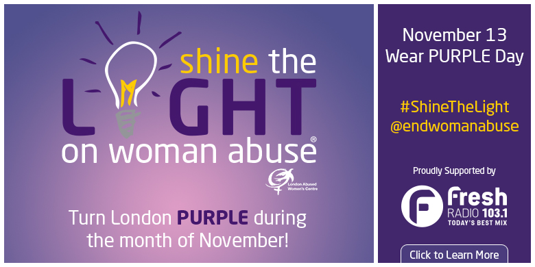 The goals of the Shine the Light on Woman Abuse campaign are to raise awareness of men’s violence against women by turning communities purple for the month of November. Purple is a symbol of courage, survival and honour, and has come to symbolize the fight to end woman abuse.