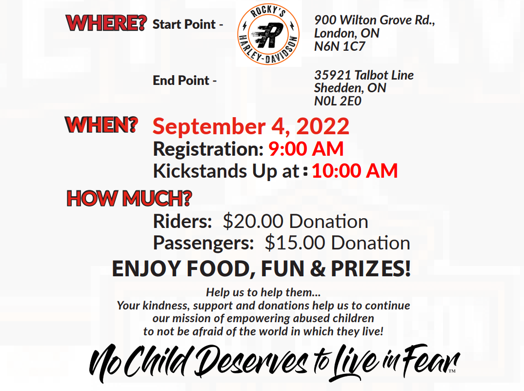 Summer Charity Motorcycle Ride Where Rocky's Harley-Davidson, 900 Wilton Grove Rd., London, ON, Canada Map When Sep 04/22 07:00 AM - Sep 04/22 05:00 PM Age All Price Starting at $20 Per Bike Buy Tickets Website https://www.facebook.com/events/1920529691477215/?acontext=%7B%22event_action_history%22%3A[%7B%22mechanism%22%3A%22search_results%22%2C%22surface%22%3A%22search%22%7D]%2C%22ref_notif_type%22%3Anull%7D