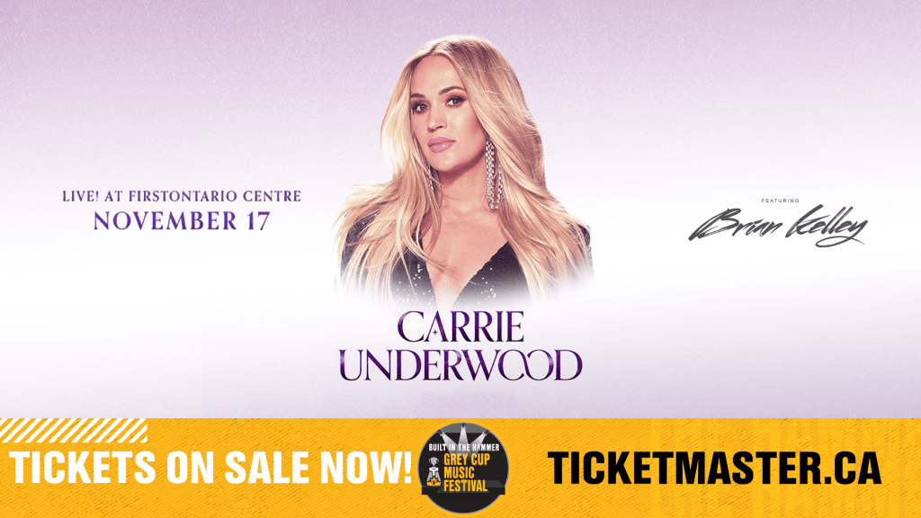 The Hamilton Tiger-Cats and the 2023 Grey Cup Festival announced Tuesday, one of the biggest names in music, Carrie Underwood will headline Friday night of the Built in the Hammer Grey Cup Music Festival. News of the multi-format, multi-media superstar’s concert at Hamilton’s FirstOntario Centre on Friday, November 17 is just the beginning. GRAMMY© – nominated superstar Brian Kelley will be opening for the superstar.