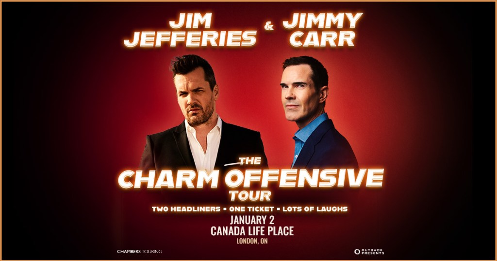 Outback Presents is thrilled to announce that due to popular demand, comedy power houses Jim Jefferies and Jimmy Carr have extended their Charm Offensive Tour in Canada to start 2025 with a bang! Four new markets have been added following great success in Halifax, Ottawa, Toronto, Edmonton, Calgary, Kelowna, Vancouver and Victoria. Fans in London, Winnipeg, St. Catharines and Kingston will now have a chance to see this action packed show in their town from January 2 to 5, 2025, prolonging their holiday festivities with guaranteed non-stop laughter.