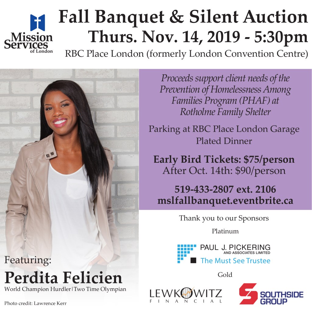 Join us Thursday, November 14, 2019 at the RBC Place London (formerly London Convention Centre) for the Fall Banquet & Silent Auction featuring keynote speaker Perdita Felicien.